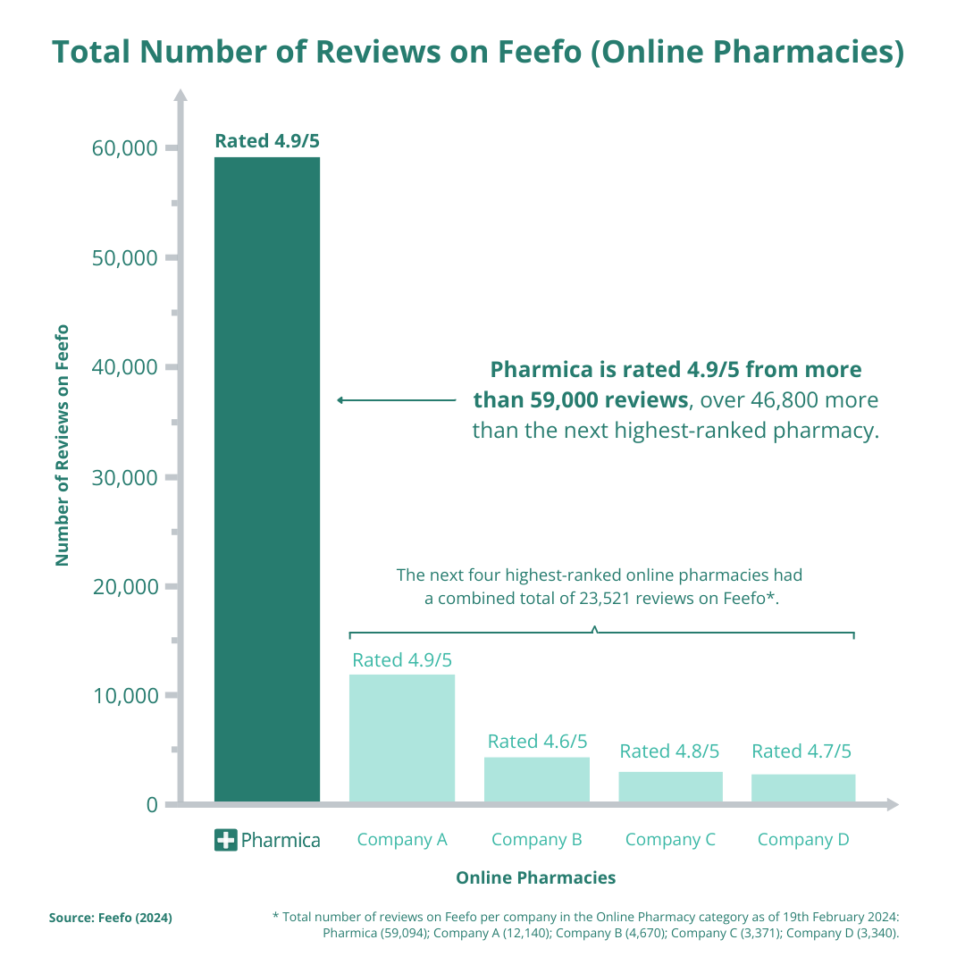 Pharmica has the joint-highest customer rating (4.9 out of 5) among all online pharmacies on Feefo and surpasses its closest competitor by more than 46,800 genuine online reviews. This gap considerably substantiates Pharmica’s rating and exemplifies the exceptionally high level of trust customers and patients place in the company’s services compared to other online pharmacies.